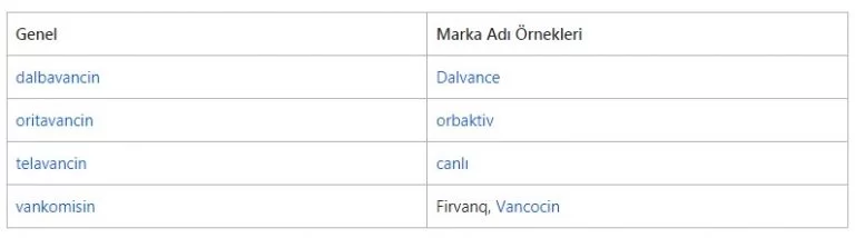 Bu grubun üyeleri, metisiline dirençli stafilokok aureus (MRSA) enfeksiyonlarını, komplike cilt enfeksiyonlarını, C. difficile ile ilişkili diyareyi ve beta-laktamlara ve diğer antibiyotiklere dirençli endokardit gibi enterokok enfeksiyonlarını tedavi etmek için kullanılabilir.  antibiyotik isimleri Yaygın ilaç isimleri şunları içerir: