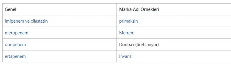 Bu enjekte edilebilir beta-laktam antibiyotiklerin geniş bir bakteri öldürme gücü yelpazesi vardır ve mide enfeksiyonları, zatürreeler, böbrek enfeksiyonları, çoklu ilaca dirençli hastane kaynaklı enfeksiyonlar ve diğer birçok ciddi bakteri türü gibi orta ila yaşamı tehdit eden bakteriyel enfeksiyonlar için kullanılabilir. hastalıklar. Genellikle daha ciddi enfeksiyonlar için saklanırlar veya direnci önlemeye yardımcı olmak için “son basamak” ajanlar olarak kullanılırlar. antibiyotik isimleri Bu sınıfın üyeleri şunları içerir: