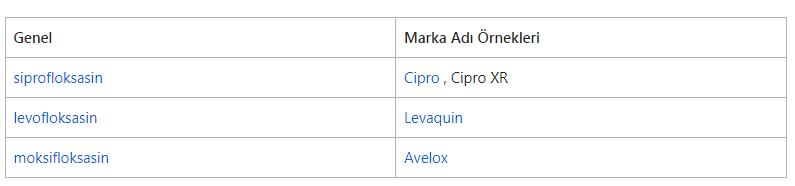 Florokinolon sınıfındaki yaygın ilaçlar şunları içerir: