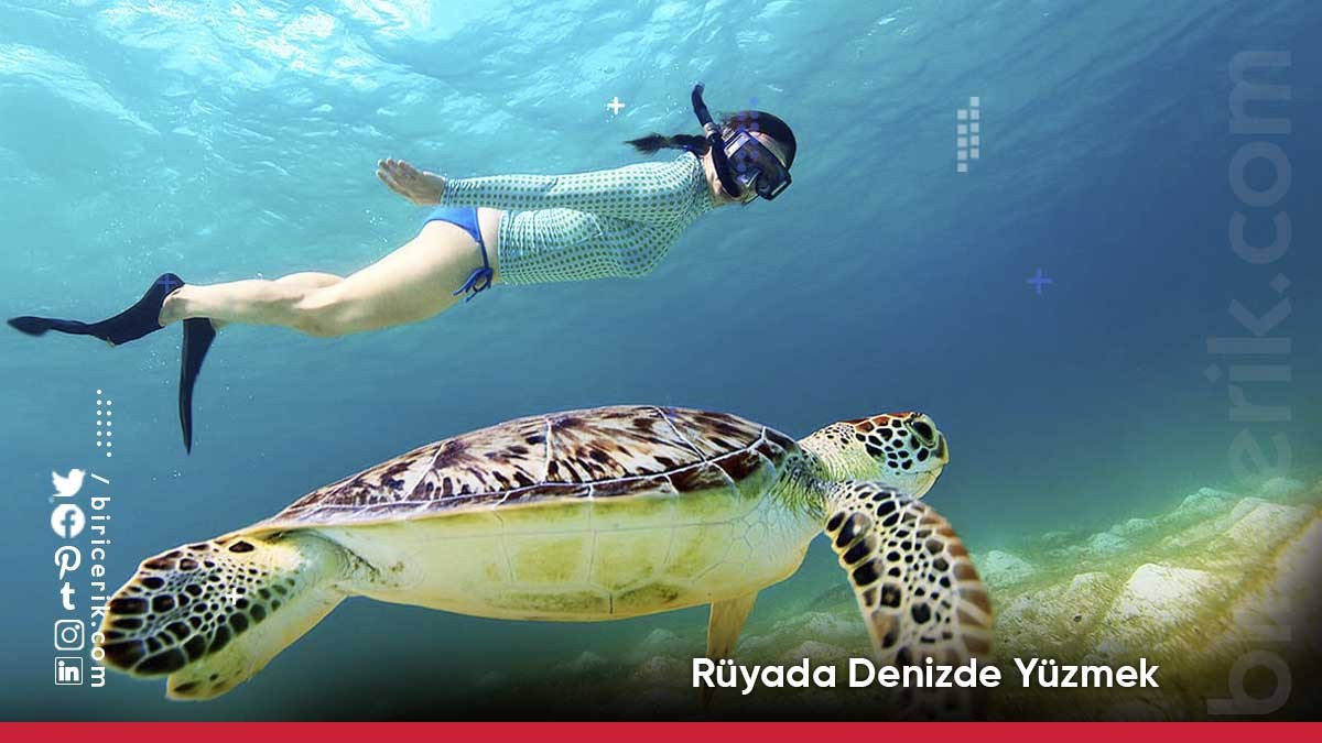 Rüyada denizde yüzdüğünü görmek, rüya tabircileri tarafından farklı farklı şekillerde yorumlanmıştır. Fakat rüyada denizde yüzmek genellikle olumlu şekilde yorumlanır. Rüyasında denizde yüzdüğünü gören kişi yaptığı işlerde başarılı, azimli, hırslı ve tuttuğunu koparan bir kişiliğe sahiptir ve rüyasında denizde yüzen kişinin bu özellikleri ön plandadır. Bu bağlamda bu rüya, başarı anlamına gelmektedir. Kişinin iş hayatında mertebe atlayacağı ve maddi anlamda gelir elde edeceğine delalet eder. Yani rüyada denizde yüzdüğünü gören kişinin ilerleyen dönemlerde para, maaş zammı, terfi alma, takdir edilme gibi durumları yaşaması yüksek bir ihtimaldir. Bunların dışında yüzülen denizin kirli ya da temiz olması önemli bir detaydır fakat genel olarak rüyada denizde yüzmek hayırlara işarettir.