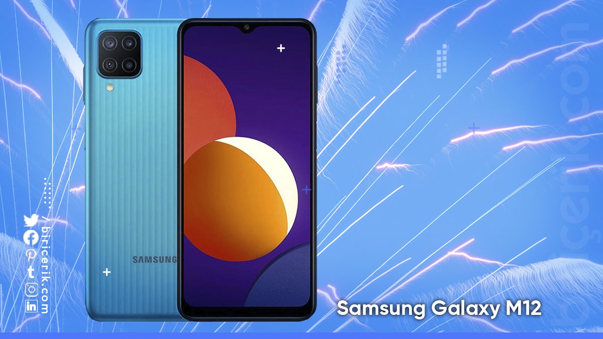 Samsung Galaxy M12 Akıllı Telefon İncelemesi , 2021 yılında piyasaya sürüldü. 164 x 75.9 x 9.7 mm ölçü boyutlarında ve 221 gram ağırlığında olmaktadır. PLSIPS ekranının boyutu 6,5 inç bir ekran boyutuna sahip olmaktadır. Çözünürlük 720 x 1600 piksel ve inç başına piksel yoğunluğu 270 ppi yoğunluğunda olan bir akıllı telefon modeli olmaktadır. Selfie ön kamera tek, arka 8 MP özelliğinde olmaktadır. Arka taraf fotoğraf ve videodan sorumlu başarılı bir kısım olmuştur. Dörtlü kamera 48MP, işlemci 8 çekirdekli depolama (4×2.0 GHz Cortex-A55 ve 4×2.0 GHz Cortex-A55) 32GB 3GB RAM boyutunda, 64GB 4GB RAM boyutunda, 128GB 4GB RAM boyutunda, 128GB 6GB RAM boyutunda olan bir akıllı telefon modeli olmaktadır.6000mAh batarya gücüne sahiptir.